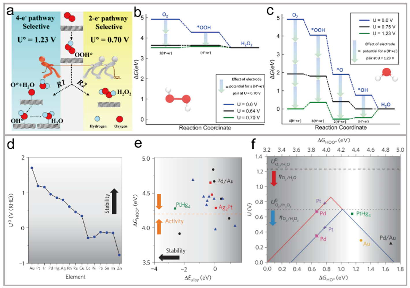 ORR過程分為兩電子反應-生成OOH- /H2O2和四電子反應-生成OH-/H2O。這兩種不同的反應途徑之間存在明顯的競爭。由于兩電子過程只涉及到*OOH中間體,所以其機理顯然是最簡單的反應步驟。*OOH中間體(ΔG(*OOH))的結合自由能決定了催化活性和選擇性。不同的化學中間體如*OOH、*O和*OH通過多種途徑參與四電子過程,包括*OOH締合、*OOH解離和軸端吸附途徑。