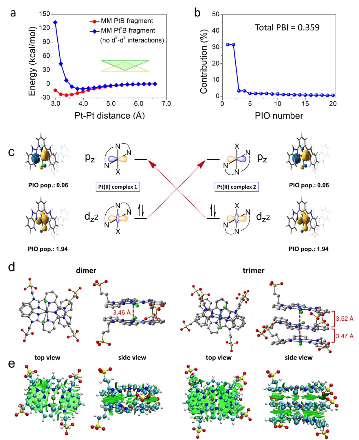 作者通過主作用軌道分析表明,Pt…Pt相互作用對PtB-core的結合起著關鍵作用,其本質是二聚體中單體占據的dz2軌道和非占據pz軌道在z方向上的彼此間電子轉移相互作用,因此,Pt…Pt相互作用屬于長程的色散相互作用且具有明顯的方向性,可誘導分子組裝過程分子的有序排列。NCI分析結果,表明PtB中Pt···Pt和π-π相互作用共存,兩者協同起來驅動分子組裝過程(圖3)。