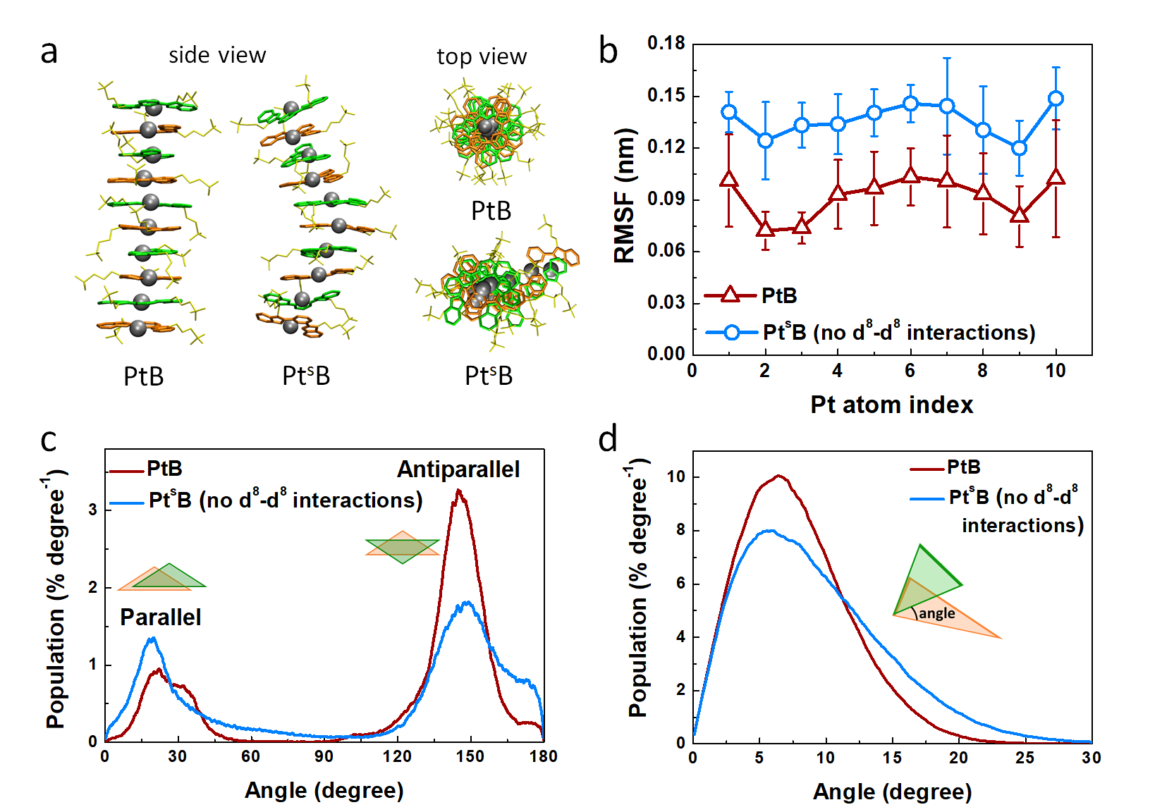 接著,基于新開發的力場參數采用分子動力學模擬,作者考慮了PtB體系、不含d8-d8相互作用的PtsB體系和去掉Pt(II)的Pt-free三種體系的分子組裝過程,模擬結果表明,PtB對應十聚體組裝結構緊致有序;PtsB對應十聚體松散彎曲;而Pt-free體系則是無歸團聚(圖4)。肯定了Pt···Pt與π-π相互作用在驅動Pt(II)配合物組裝過程和誘導有序結構形成中的重要作用。