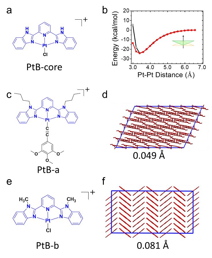 作者進一步開展分子動力學模擬以在微觀層面解釋PtB的分子組裝機理。然而,常用力場庫中沒有Pt(II)的力場參數,給這類體系分子組裝過程的模擬帶來極大的挑戰。為了揭示Pt…Pt相互作用在PtB自組裝過程中的作用,作者開發了一套專門用于Pt(II)配合物分子動力學模擬的力場參數(圖2)。通過PtB-core單體及二聚體進行QM和MM計算,發現當Pt-Pt距離~3.38 ?時,PtB-core分子間相互作用可達-25 kcal·mol-1,此時對應的Pt…Pt相互作用強度為-2.52 kcal·mol-1,與苯二聚體對應的π-π相互作用相當。所得力場參數能夠很好的重現先前Pt(II)配合物PtB-a和PtB-b的晶體結構數據,進一步證實了力場參數的可靠性。
