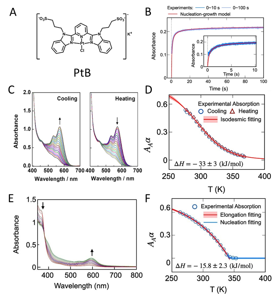 北京理工大學化學與化工學院李澤生教授團隊的鄭小燕副研究員、香港科技大學的黃旭輝教授和香港大學的任詠華院士合作對不同溶劑環境下兩親性Pt(II)配合物PtB的分子組裝機制進行了系統的研究。由于分子間Pt···Pt相互作用會產生新的光譜信號,通過變溫紫外可見光譜可獲取平衡態PtB的組裝體相對于單體的比例(α)隨溫度的變化,作者分別通過等鍵模型(Isodesmic model)和成核增長模型(Nucleation-Elongation model)擬合不同溶劑下PtB的α-T曲線來探索其分子組裝體生長機制。研究發現:在純水溶液中,α-T曲線符合等鍵增長模型,所得平衡常數分別為Ke300K = 2.4×103 M-1和Ke368K = 2.6×102 M-1;在丙酮和水混合溶液中,α-T曲線符合成核增長模型,所得平衡常數為Ke298K = 2.6×103 M-1和Ke328K = 1.4×102 M-1。同時成核過程對應的平衡常數為5.0×10-6。此外,作者通過Stopped-flow吸收光譜實驗測定了PtB在丙酮和水混合溶液中的組裝過程動力學。結果發現,實驗數據符合成核增長模型:在t="0.1s時,PtB具有1.1×10-6 M s-1的成核速率,隨后成核速率急劇下降直至1.0 s時幾乎可忽略不計。在t="0.1s時,PtB的生長速率為10.6" s-1,隨著PtB單體被消耗和分子組裝體間的融合,其生長速率逐漸降低。這一結果表明PtB在丙酮和水混合物溶液中的組裝過程符合成核增長形成機制。