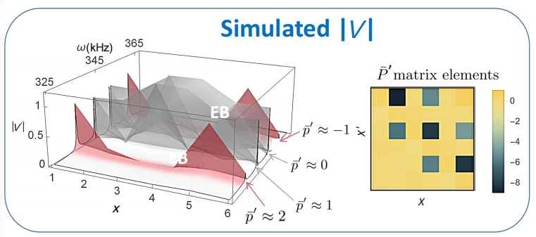 在圖2中,研究人員展示了具體的電路仿真結(jié)果。其中左圖為電壓分布結(jié)果,它的x,y和z三個(gè)坐標(biāo)軸分別代表電路的6個(gè)節(jié)點(diǎn),頻率范圍以及電壓分布。研究人員根據(jù)諧振頻率下的電壓分布圖可以直接讀出奇異束縛態(tài)特性。從圖中結(jié)果可以看出,高電壓主要分布在4個(gè)頻率上。這4個(gè)頻率即為我們奇異束縛態(tài)系統(tǒng)的4個(gè)本征值,他們相應(yīng)的電壓即為本征態(tài)。進(jìn)一步,研究人員還通過(guò)阻抗矩陣還原了奇異束縛態(tài)系統(tǒng)的哈密頓量。它的矩陣元分布如右圖所示,研究人員發(fā)現(xiàn)它與晶格模型的哈密頓量基本一致。因此,研究人員完全可以基于電路系統(tǒng)去實(shí)驗(yàn)實(shí)現(xiàn)奇異束縛態(tài)。