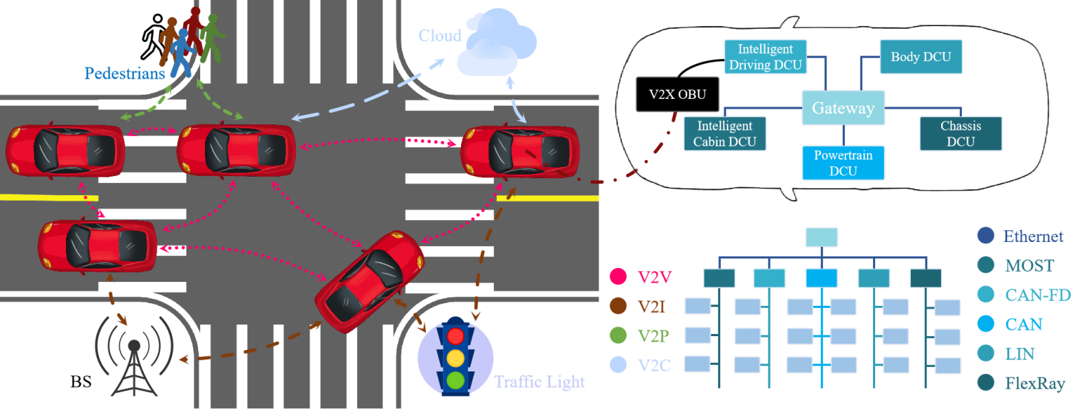 文章圍繞車輛通信與智能網聯化控制中的核心問題——通信與控制集成,針對車內網絡通信與車輛自主運動控制集成、車際網絡通信與車輛協同運動控制集成,以及車內-車際復合通信與車群運動控制集成等方面開展系統性綜述研究。在此基礎上,提出了未來先進車內網絡、車際網絡及其新型組網架構的技術構想,凝練了現有研究中尚未解決的科學問題,并對未來面臨的技術挑戰開展了討論。