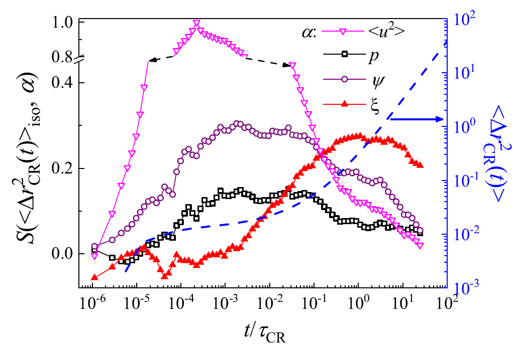 圖3 不同的靜態量包括Debye-Waller因子< u 2>,其簡諧近似下的均方位移ψ,低頻振動模的參與分數p,以及塑性長度ξ與動態量<<?r2CR(t)>>的Spearman等級相關系數S。