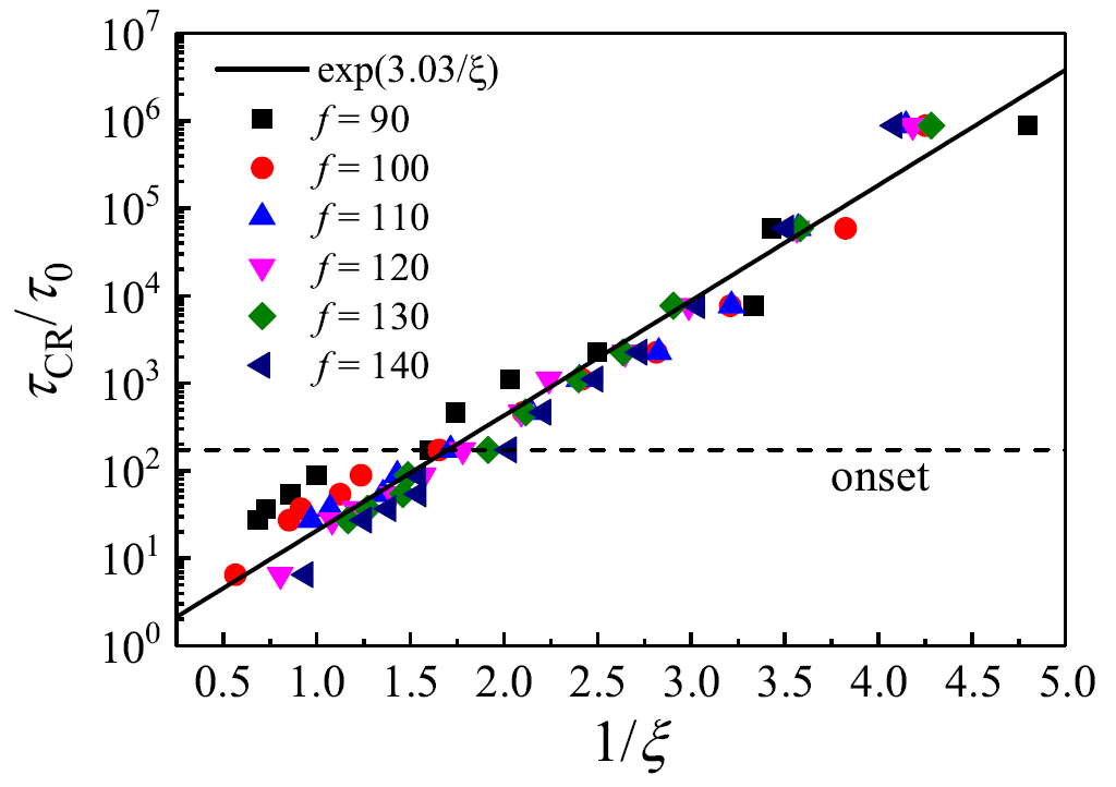 團隊設計了新的探測玻璃體系靜態結構的手段,具體為,在短時間內,對粒子施加一固定大小,方向隨機選取的力,觀察撤去力之后,粒子不能回彈的位移,即不可逆位移有多大。圖1(a)展示了當對粒子在0.1(約化單位)時間間隔內施加一外力大小為f = 100(約化單位)的力時,粒子平均位移隨時間的演化規律。較長時間下,此平均位移趨近一平臺值,即黑色虛線標出的不可逆位移L(T, f),顯然,溫度越低,不可逆位移L(T, f)越小。近一步的研究發現,L(T, f)正比于 T - T 0 (圖1 (b)),其中 T 0為Vogel–Fulcher–Tammann (VFT) 方程預測的非晶體系的理想玻璃化轉變點,因此,L(T, f)在理想玻璃化轉變點外推為0。進一步分離變量,我們可得到L(T, f) = ξ(T)A(f), 其中塑性長度ξ(T)∝( T - T 0 ), A(f) ∝( f - f 0)。塑性長度ξ(T)與體系弛豫時間存在指數依賴關系(圖2),因此建立了塑性長度與非晶體系慢動力學的聯系。