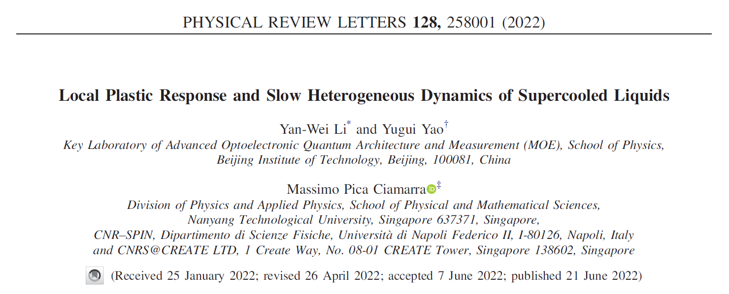 相關工作發表在Physical Review Letters上,北京理工大學物理學院李艷偉研究員為第一作者兼通訊作者,北京理工大學物理學院姚裕貴教授和新加坡南洋理工大學Massimo Pica Ciamarra為論文共同通訊作者。該工作第一單位為北京理工大學物理學院,并得到國家自然科學基金、北京理工大學青年學者學術啟動計劃等項目的支持。