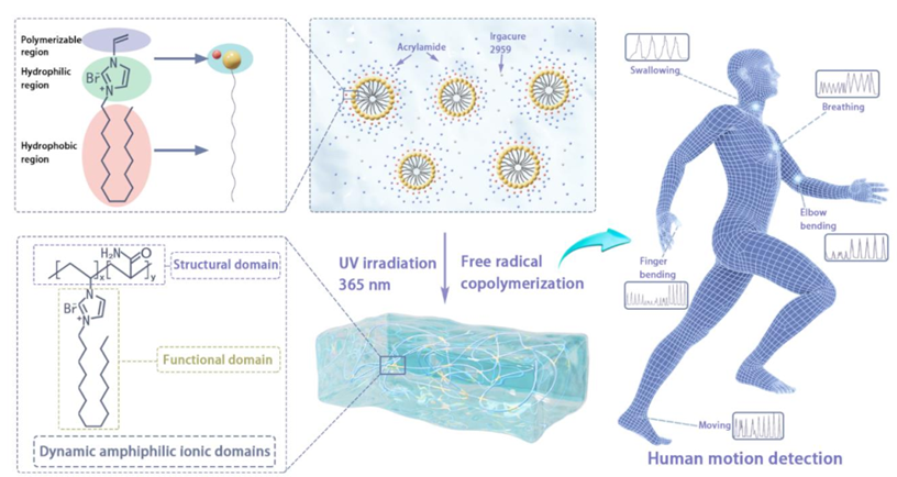 基于前期研究基礎,團隊進一步提出了“動態兩親離子域(DAID)”的設計策略,采用具有兩親性結構的可聚合IL單體,與丙烯酰胺單體共聚,合成了兼具高應變(1200-2390%)、強韌性(5-15 MJ -3)、優異電導率(0.13-0.2 mS cm-1)和高抗裂紋擴展能力的功能凝膠(圖2)。在凝膠的三維聚合物網絡中,ILs的結構域提高了聚合物的內聚強度;同時,ILs陽離子的長疏水烷基鏈作為物理交聯點提供了良好的疏水結合以增強力學性能。因此,DAID的引入可使聚丙烯酰胺親水鏈在大變形過程中逐漸展開。