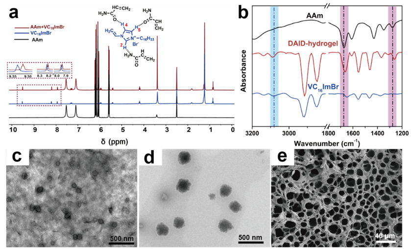 1H核磁共振和傅里葉變換紅外光譜(FT-IR)等手段表明不同單體間(即,丙烯酰胺與ILs)存在強相互作用(圖3a和b)。當ILs濃度高于臨界膠束濃度時,通過非共價相互作用可自組裝形成膠束(圖3c)。圖3d進一步證實了丙烯酰胺和ILs膠束由于相互作用而發生聚集,從而形成了尺寸更大的混合單體體系。最終,DAID的引入使凝膠呈現出致密的網絡結構(圖3e)。
