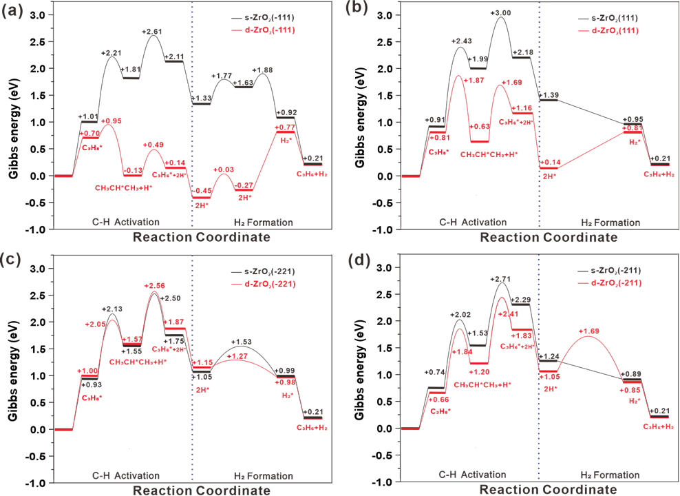 圖2 不同晶面ZrO2的PDH反應(yīng)能壘圖。黑色為完整表面,紅色為缺陷表面,T="823.15" K,P="1" atm