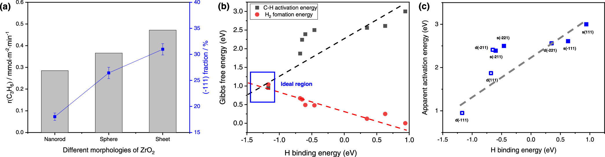 圖3 (a) PDH反應(yīng)中丙烯的生成速率(r(C3H6))(灰色柱狀)和不同形貌ZrO2的(-111)晶面比例(藍(lán)色方框)。(b) Gibbs自由能壘與H原子結(jié)合能的關(guān)系圖,黑色為C?H鍵斷裂能壘,紅色為H2生成能壘。(c) 不同晶面ZrO2的表觀(guān)活化能與H原子結(jié)合能的關(guān)系