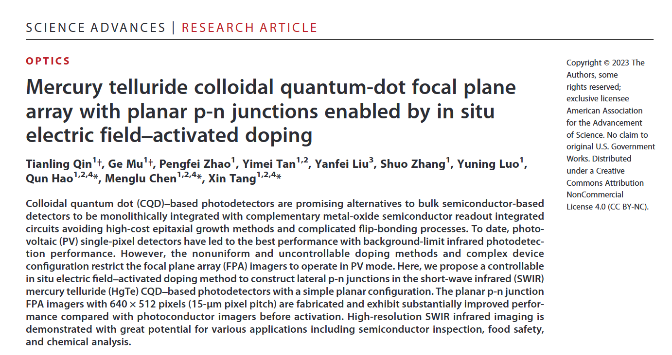 綜上所述,北京理工大學研究團隊開發了一種可控的電場激活原位摻雜方法,研究了不同離子對摻雜濃度的作用機制,在光導型膠體量子點紅外探測器內構建了橫向p-n結,實現了相比于未電場激活摻雜前性能顯著提高的平面光伏型膠體量子點短波紅外成像芯片制備,展示了在半導體檢測、食品檢測、化學分析等方面的應用潛力。該工作得到了中芯熱成在焦平面探測器制備和焦平面成像系統測試方面的大力支持。