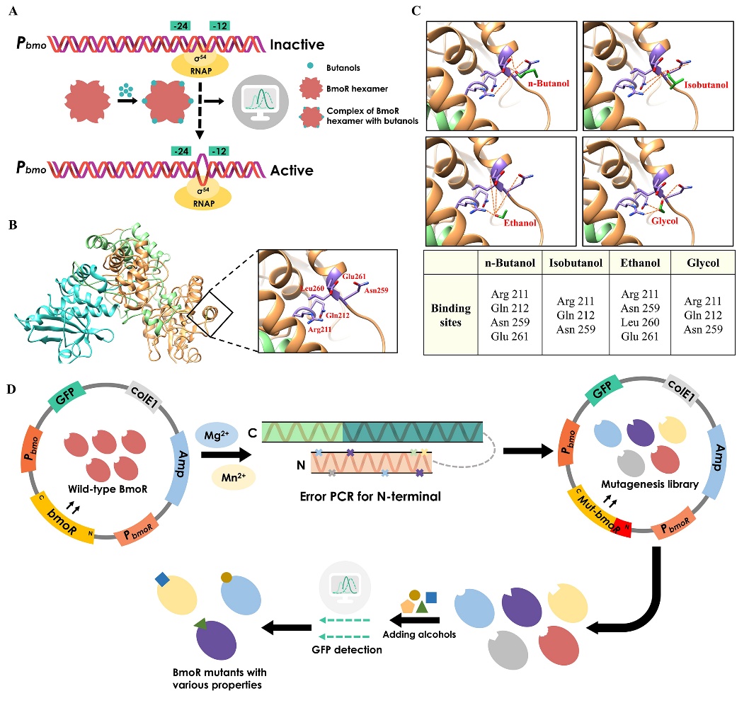 目前,有關轉錄因子調控的生物傳感系統的研究報道還無法實現對高價值化合物及其類似物的定向檢測。北京理工大學生命學院的霍毅欣教授課題組針對該問題,基于以C2-C5高級醇作為信號分子的轉錄因子BmoR,構建了轉錄因子BmoR驅動的高級醇生物傳感系統。由于野生型BmoR特性受限,無法實現對高級醇分子的特異檢測,針對BmoR的N端功能區域進行理性和非理性設計及改造(圖1)。