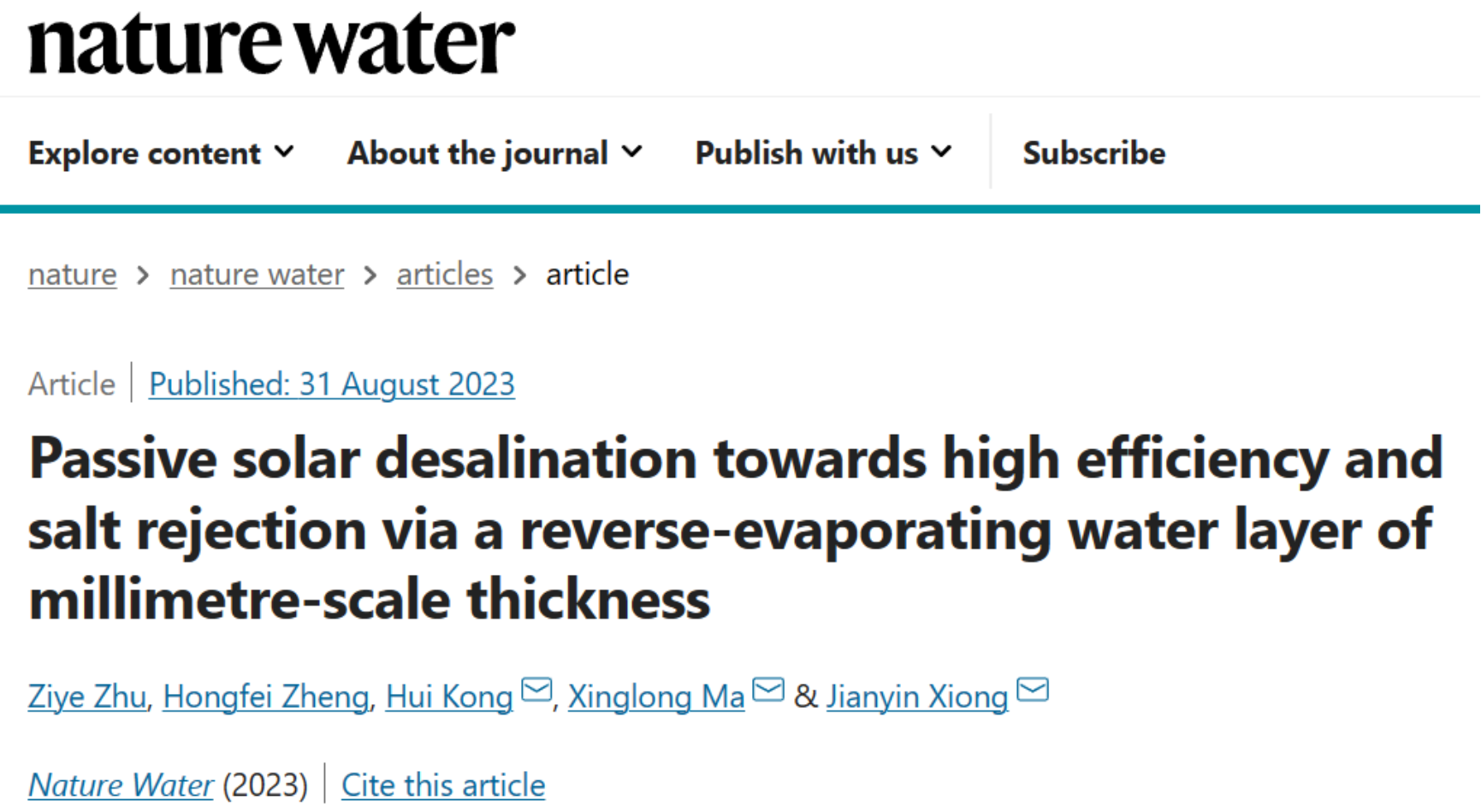 論文詳情:Ziye Zhu, Hongfei Zheng, Hui Kong*, Xinglong Ma*, Jianyin Xiong*. Passive solar desalination towards high efficiency and salt rejection via a reverse-evaporating water layer of millimetre-scale thickness. Nature Water (2023). https://doi.org/10.1038/s44221-023-00125-1