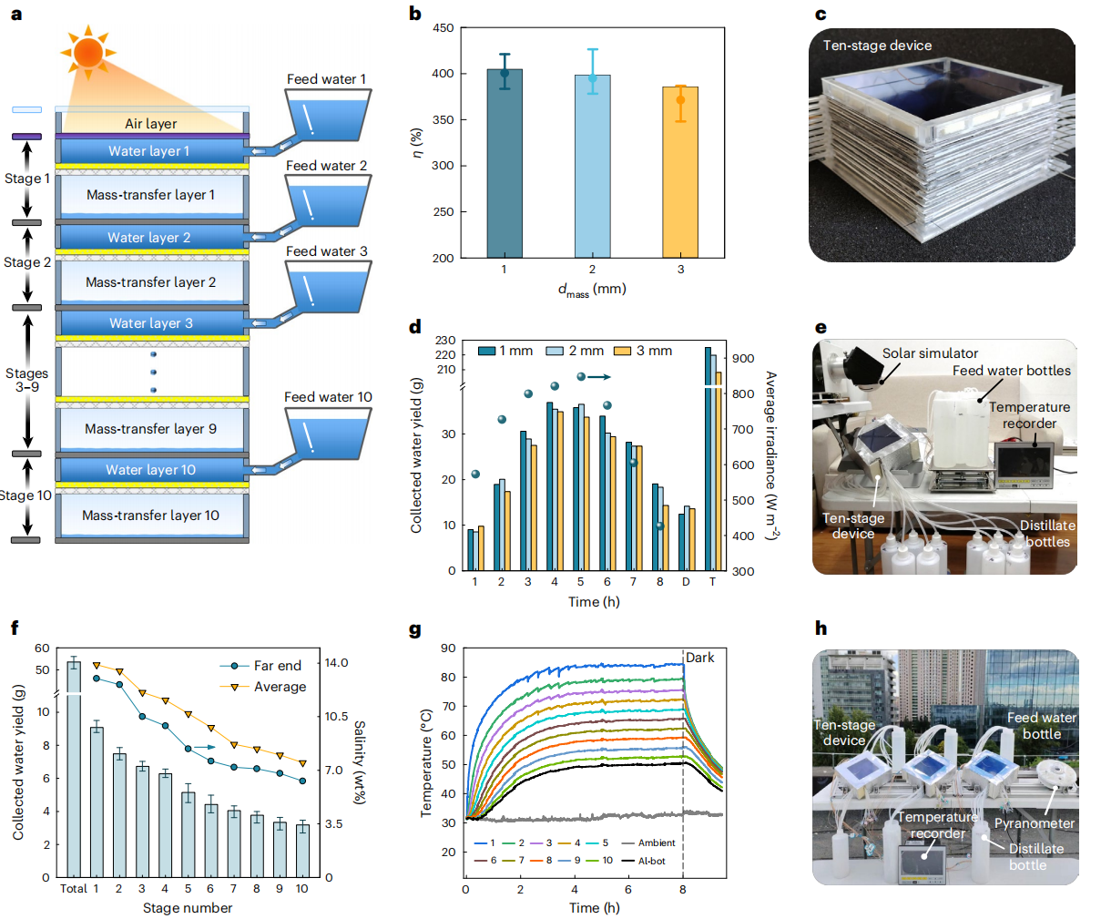 研究揭示了逆向蒸餾系統發生結鹽的機理并以可視化的方式詮釋了基于水層的逆向蒸餾裝置抗鹽與排鹽的原理。實驗結果表明,單級蒸餾裝置在常規3.5 wt%鹽水環境下實現了60.6 %的太陽能到水的轉化效率,并在21 wt%濃鹽水環境下以47.4 %的效率可持續地蒸餾。具有10級水層回熱結構的裝置在常規3.5 wt%鹽水環境下取得了354 %的高效率,并在每一級水層中都成功實現了抗鹽功能。