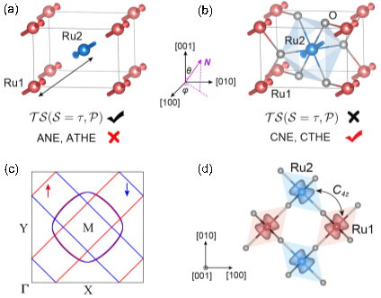 圖1:(a-b) 交錯磁體RuO2的晶體結構和磁結構;(c-d) 交錯磁體RuO2在倒空間的自旋極化費米面和在實空間的自旋極化電荷密度。