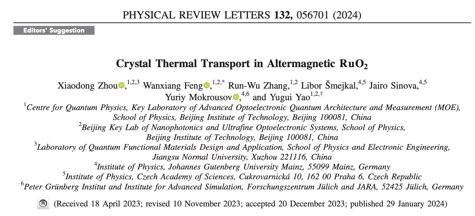 文章信息(*為通訊作者):Xiaodong Zhou, Wanxiang Feng*, Run-Wu Zhang, Libor ?mejkal, Jairo Sinova, Yuriy Mokrousov, and Yugui Yao*, “Crystal Thermal Transport in Altermagnetic RuO2”, Phys. Rev. Lett. (Editors' Suggestion) 132, 056701 (2024).