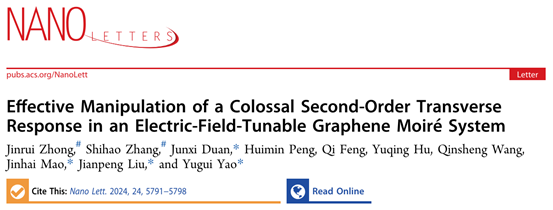 Jinrui Zhong#, Shihao Zhang#, Junxi Duan*, Huimin Peng, Qi Feng, Yuqing Hu, Qinsheng Wang, Jinhai Mao*, Jianpeng Liu*, and Yugui Yao*,“Effective Manipulation of a Colossal Second-Order Transverse Response in an Electric-Field-Tunable Graphene Moire? System”,Nano Lett. 24, 5791?5798 (2024)  (#為共同一作,*為通訊作者)