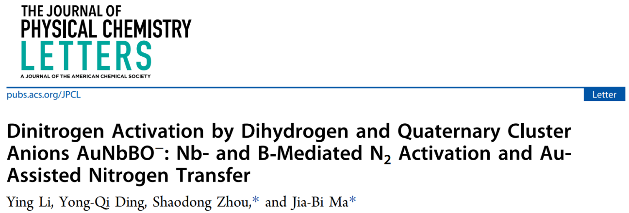 近日,北理工化學與化工學院馬嘉璧副教授團隊通過質譜實驗和理論化學計算相結合的方法對N2和H2與AuNbBO?氣相團簇的反應性及結構進行了深入研究,實現了室溫下直接偶聯N2和H2生成包含亞氨基(*NH)單元為主、含少量氨基(*NH2)單元的產物,該單元是N2氫化反應合成氨過程中的重要中間體。相關成果以“Dinitrogen Activation by Dihydrogen and Quaternary Cluster Anions AuNbBO?: Nb- and B-Mediated N2 Activation and Au-Assisted Nitrogen Transfer”為題,發表在國際權威期刊《The Journal of Physical Chemistry Letters》(2022, 13, 4058?4063)。化學與化工學院碩士生李穎為第一作者,我校的馬嘉璧老師為論文的通訊作者。