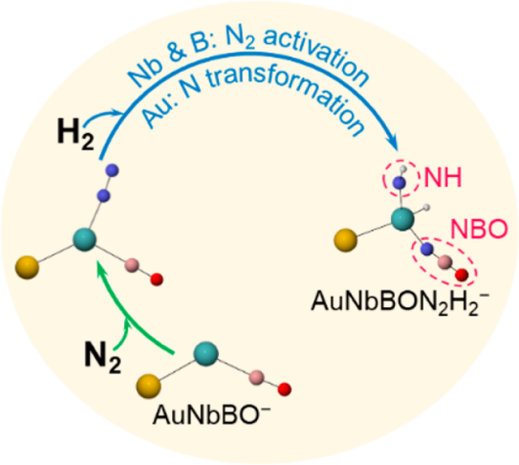 在國家自然科學基金委重大研究計劃的支持下,我校化學與化工學院馬嘉璧副教授團隊在前期的研究基礎上,實現了四元團簇AuNbBO?陰離子對N2和H2的有效活化,并生成亞氨基(*NH)單元為主、含少量氨基(*NH2)單元的產物AuNbBON2H2?。在這個反應中,Nb和B原子協同解離N2,Au原子作為還原劑促進轉移活化的N原子,從而進行后續氫化過程;三中心二電子鍵的形成促進了N2活化和N轉移。這一研究表明貴金屬協同的前過渡金屬硼化物團簇對于促進N?N鍵和H?H鍵的斷裂有著較高的反應性,并且形成了N2氫化反應中重要的中間體,即*NH(或者*NH2)和*NBO單元。這些研究結果為設計用于N2和H2合成NH3的新型催化劑提供了新的思路。