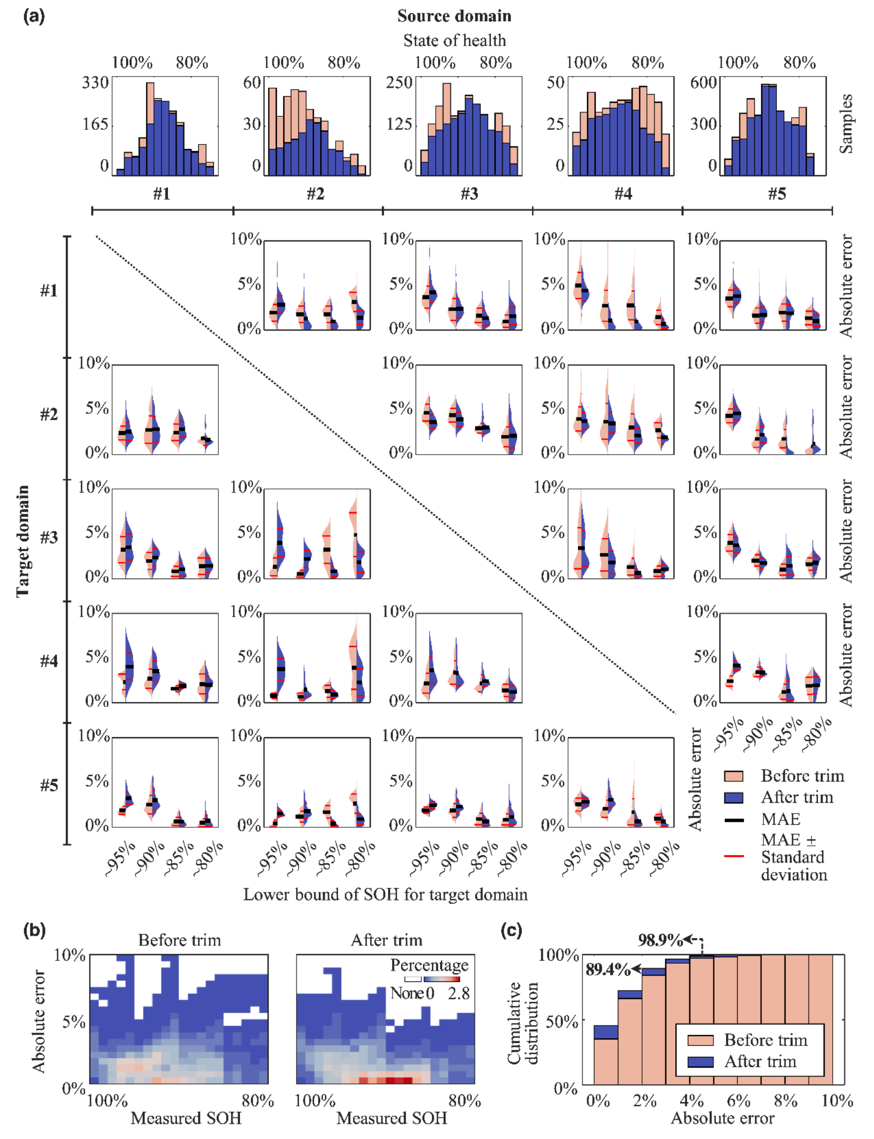經過5款電池(共71,588個樣本)的交叉驗證(圖2),結果表明,該框架在毫無新電池全壽命周期老化實驗數據下能夠確保89.4%樣本的估計絕對誤差在3%以內,同時確保98.9%樣本的估計絕對誤差在5%以內,最大誤差在8.87%以內。更重要的是,該框架利用約0.7小時的訓練時間避免了耗時數月甚至數年的目標電池全壽命周期老化實驗。這些發現為鋰離子電池管理算法的快速開發提供了全新思路。