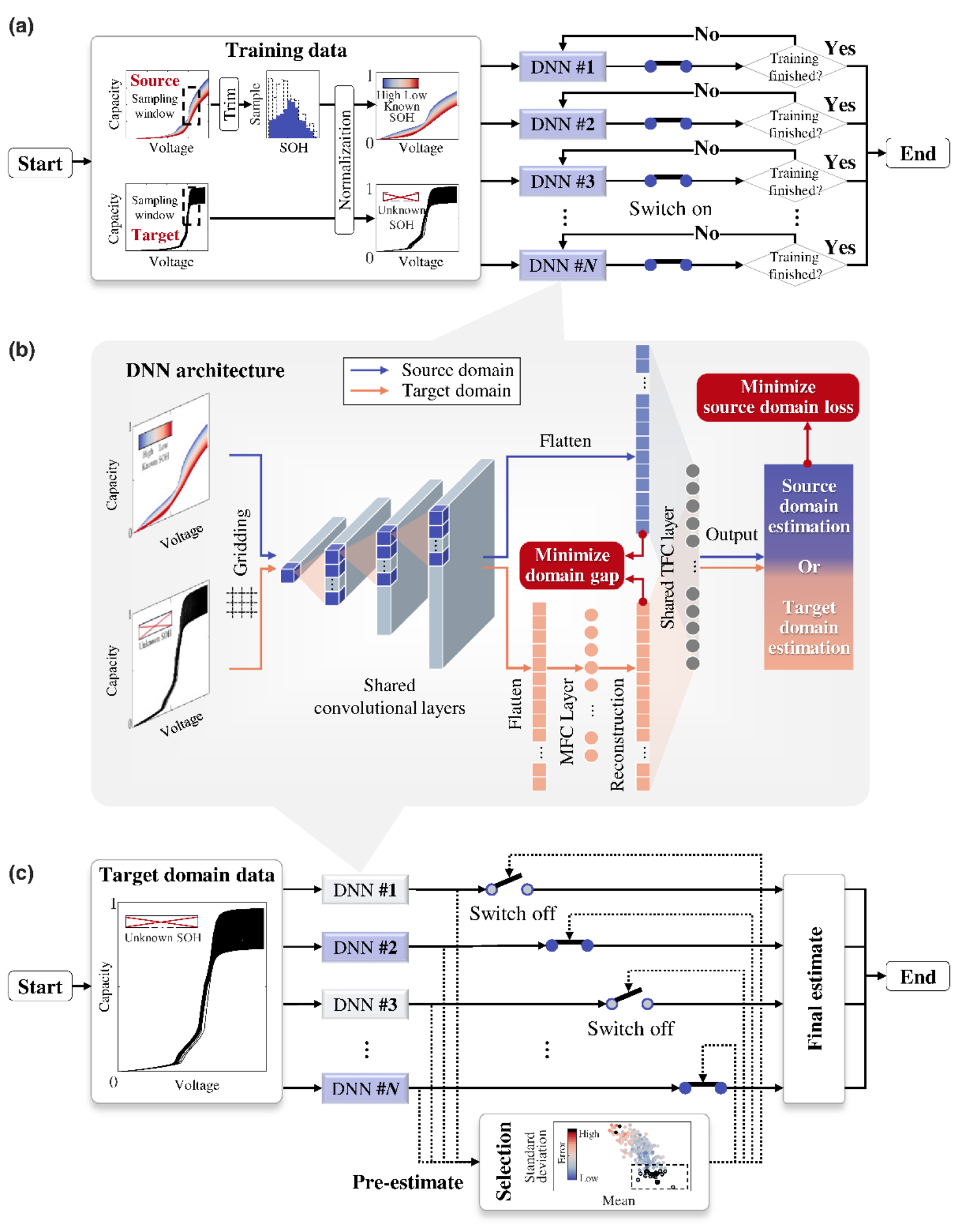 該在該工作中,研究人員設計了一個利用已有電池的實驗數據直接開發新電池健康狀態估計方法的深度學習框架(圖1)。該框架集成了一個深度神經網絡群,將深度神經網絡的個體估計擴展為群體估計以降低訓練不確定性。該框架還特別針對每個深度神經網絡個體進行了最小化特征分布差異設計,以此促進已有電池的健康狀態估計知識遷移至新電池。