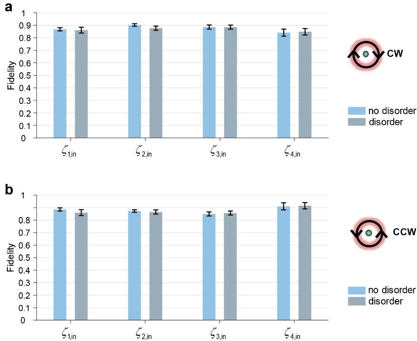 。圖 5 顯示了十組擾動的平均結果。藍色柱子代表著沒有無序的情況下,輸出態與糾纏態之間的保真度,而灰色柱子代表有無序擾動時輸出態的保真度。圖 5a 顯示了順時針環繞奇異點的情況。可以看出,對于四種不同的輸入貝爾態,有擾動時的保真度與沒有擾動時相比變化不大,且都保持在0.8 以上。圖 5b 中逆時針環繞奇異點時也有類似的結果。這說明糾纏態的手性開關確實對路徑參數的無序擾動表現出了魯棒性。