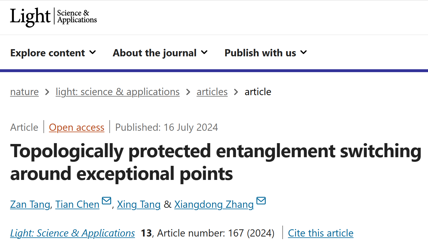 近日,北京理工大學物理學院張向東教授課題組通過設計四階簡并奇異點,實現了拓撲保護的糾纏態手性開關。相關成果以“Topologically Protected Entanglement Switching Around Exceptional Points”為題發表在Light: Science & Applications期刊[Light Sci. Appl. 13, 167 (2024)]上。該研究工作得到了國家自然科學基金委的大力支持。北京理工大學物理學院湯贊博士、陳天副教授為該論文的共同第一作者,北京理工大學物理學院陳天副教授、張向東教授為論文共同通訊作者,北京理工大學物理學院博士生唐杏也為該工作做出了重要貢獻。
