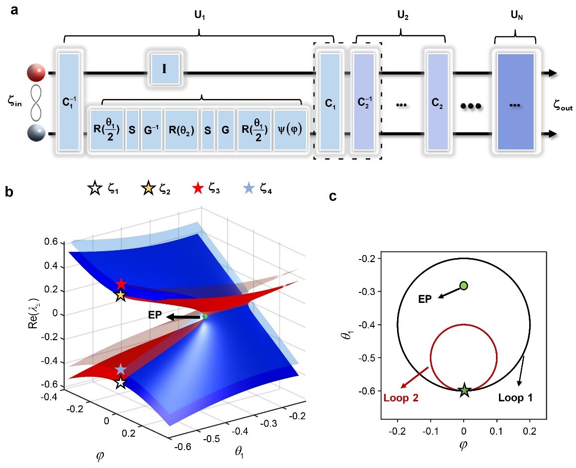 圖1. 構造非厄米量子行走實現糾纏態環繞奇異點的動態演化