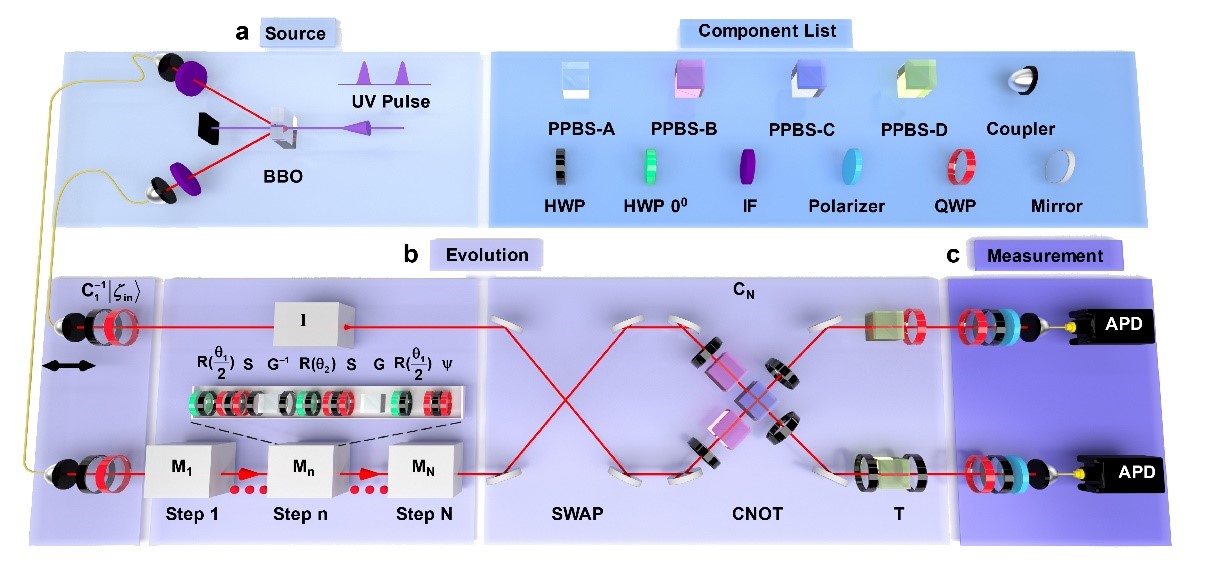 作用于四個貝爾態可以得到易于精確制備的輸入態,研究人員便通過半波片和四分之一波片來直接實現,然后將它們送入多步演化模塊中。