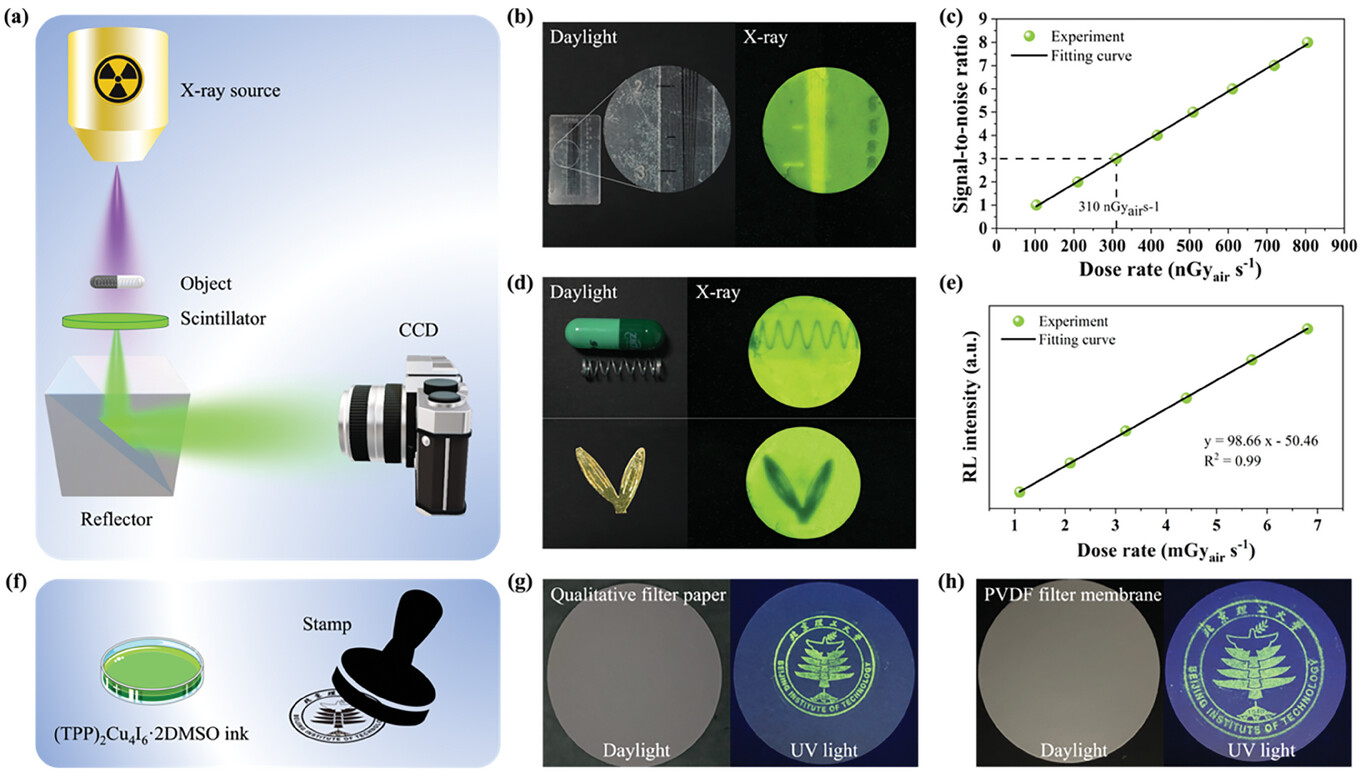 該團隊探索了(TPP)2Cu4I6·2DMSO的不同發光應用:下轉換白光LED、閃爍體、熒光墨水,實現了高效的冷白光和高質量全光譜白光、對物體的X射線成像及可見光下隱形的加密圖案。