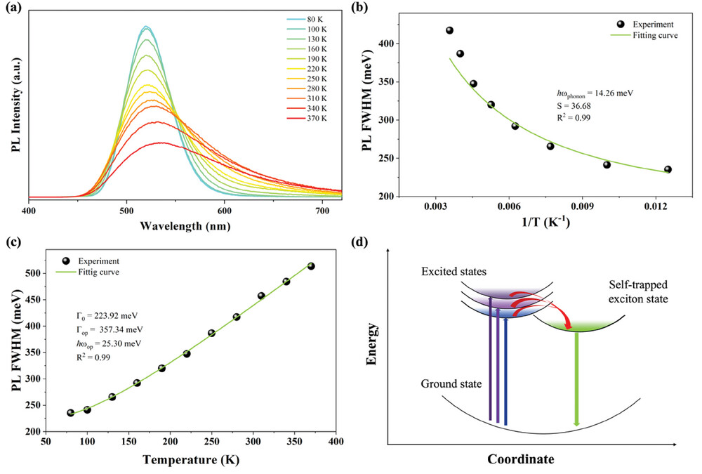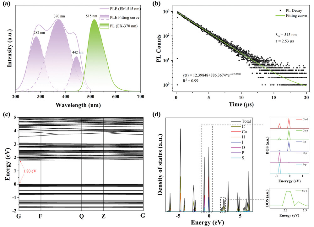 (TPP)2Cu4I6·2DMSO發光性能優異,其擁有橫跨200-500 nm的超寬激發光譜,并且在紫外光激發下展現峰值位于515 nm的綠色寬帶發射光譜,約78 nm的半峰寬以及85 nm的大斯托克斯位移,其熒光量子產率高達99.5%,是已有報道中最高效率的綠色發光材料之一。此外,其熒光壽命為2.53 s。將這些光學性質與理論計算的結果相結合,該團隊猜測其發光行為與[Cu4I6]2-多面體及STE(自限域激子)有關。