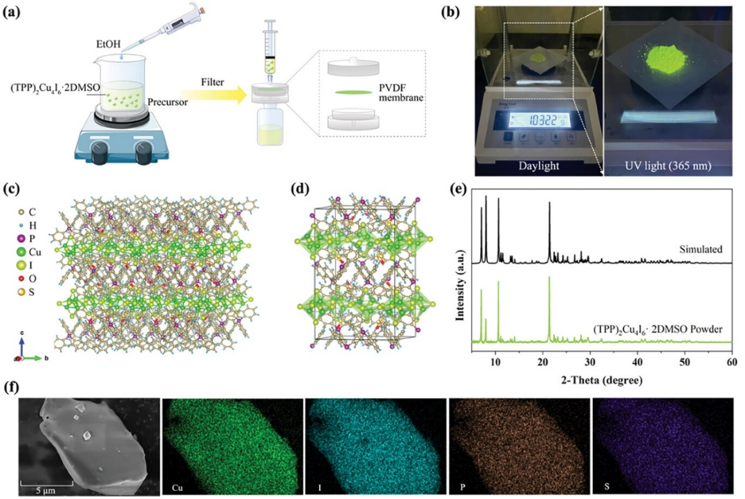 通過簡易的一步反溶劑法合成(TPP)2Cu4I6·2DMSO (TPP為四苯基磷),并使用濾膜輔助后處理獲得高質量粉末樣品,單次制備可達1克。其晶體結構中,[Cu4I6]2-多面體被大的有機陽離子TPP+和結晶分子DMSO隔離開,形成典型的有較強空間限域效應的零維電子結構。