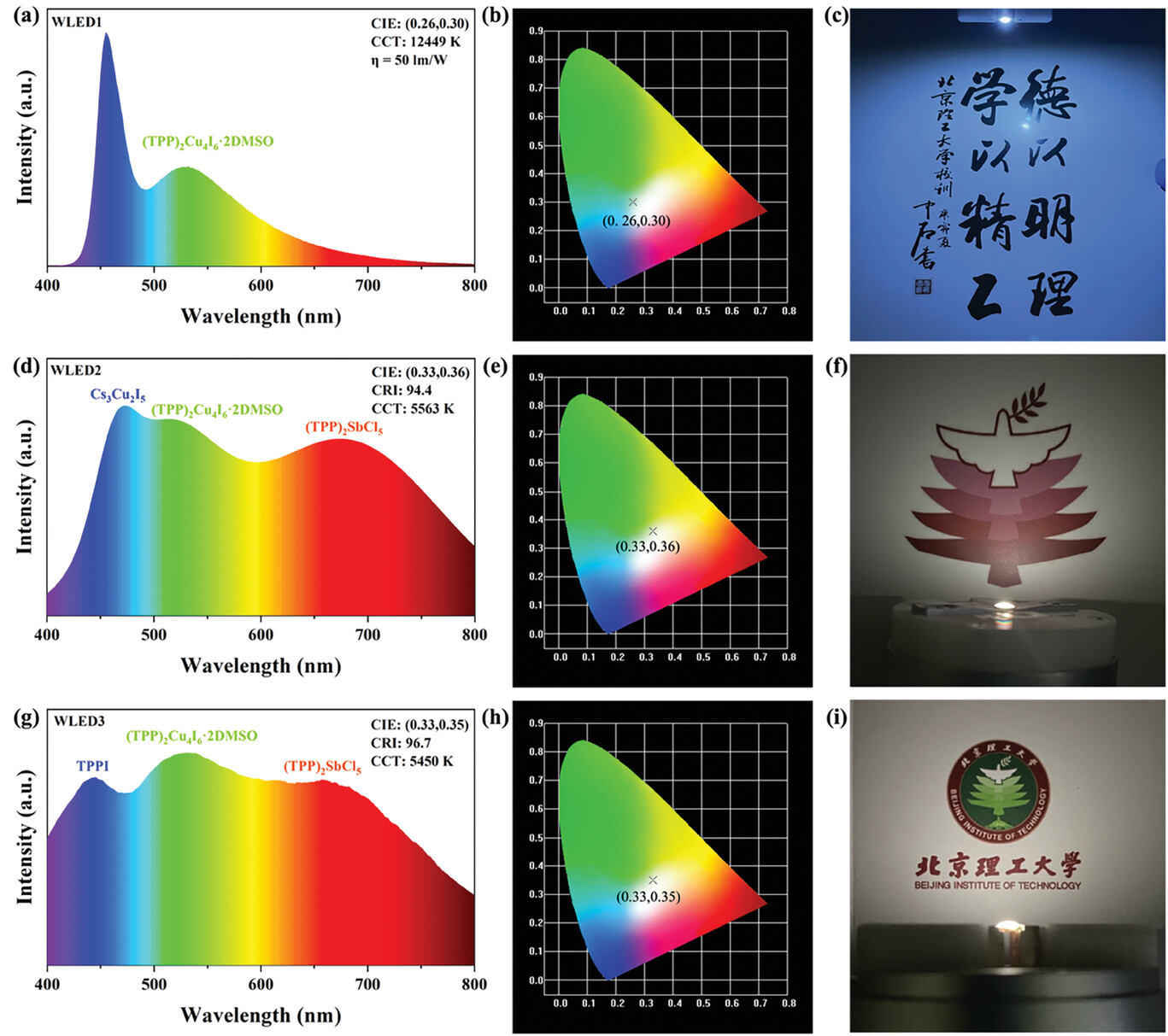 圖4. 基于(TPP)2Cu4I6·2DMSO制備的不同白光LED
