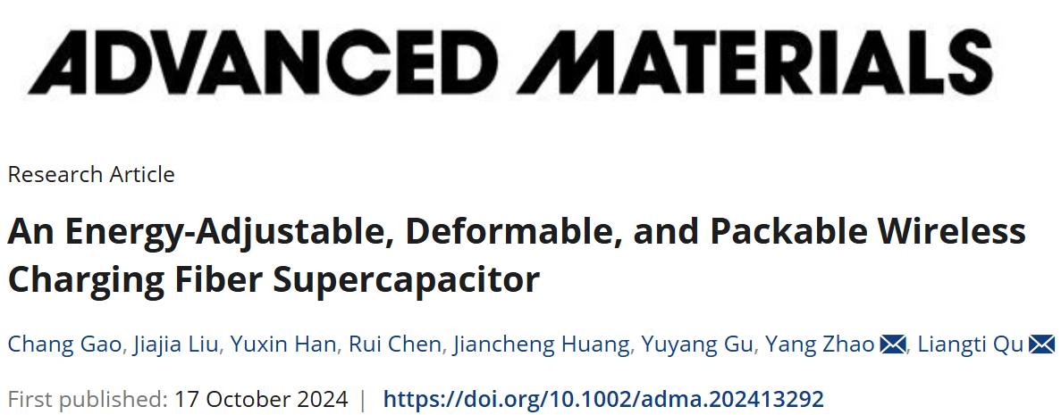 近日,北京理工大學化學與化工學院博士生高暢和碩士生劉佳佳以共同第一作者在國際頂級期刊《Advanced Materials》(IF: 32)發表題目為“An Energy-Adjustable, Deformable, and Packable Wireless Charging Fiber Supercapacitor”的研究論文(DOI:10.1002/adma.202413292)。北京理工大學為論文的第一通訊單位,化學與化工學院趙揚特別研究員和清華大學曲良體教授為共同通訊作者。