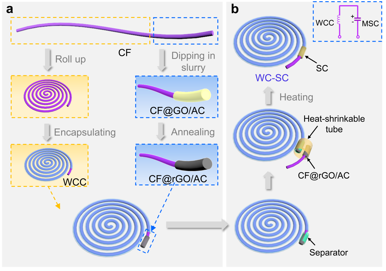 WC-SC是基于一根柔性碳纖維(CF)制備的,其總長度為64 cm。如圖1a所示,CF的一端作為WCC,另一端作為SC電極的支撐和集流體。對于WCC部分,CF的一端用絕緣雙面膠覆蓋,賦予其形狀固定能力(圖1a,左圖)。而SC電極是將CF的另一端浸漬到氧化石墨烯(GO)和活性炭(AC)漿料(圖1a,右圖)的混合物中(浸漬電極長度為1.5 ~ 8.0 cm),然后在空氣中干燥并在高溫下加熱,從而得到CF@rGO/AC復合材料。為了獲得完整的SC,依次組裝了一塊濾紙隔膜和另一個相同的CF@rGO/AC電極(圖1b),然后滴加離子液體電解質并用熱縮管包裹。圖1b插圖中WC-SC的電路圖對應無線充電部分(如WCC)和儲能部分(如MSC)。