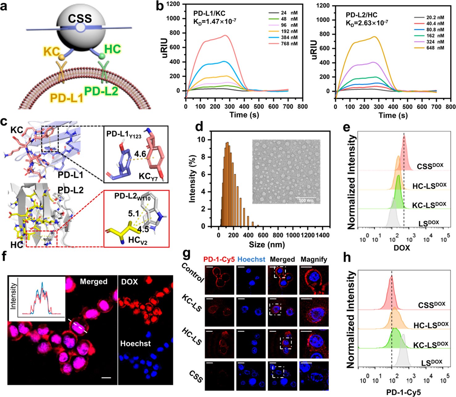 研究的主要內容介紹:分別以PD-L1和PD-L2為靶點構建多肽文庫,用微流控芯片高通量篩選出了具有高親和力( KD ≈10-7 M)和特異性的靶向多肽KC(KHTDYEYNC)和HC(HVSKTEGRHRNC),并制備功能化脂質體以構建CSS。CSS通過同時識別PD-L1/PD-L2著陸在細胞表面,增強了細胞對所負載藥物的攝取,通過對PD-L1/PD-L2—PD-1的協同阻斷實現了對PD-1的全面封鎖。