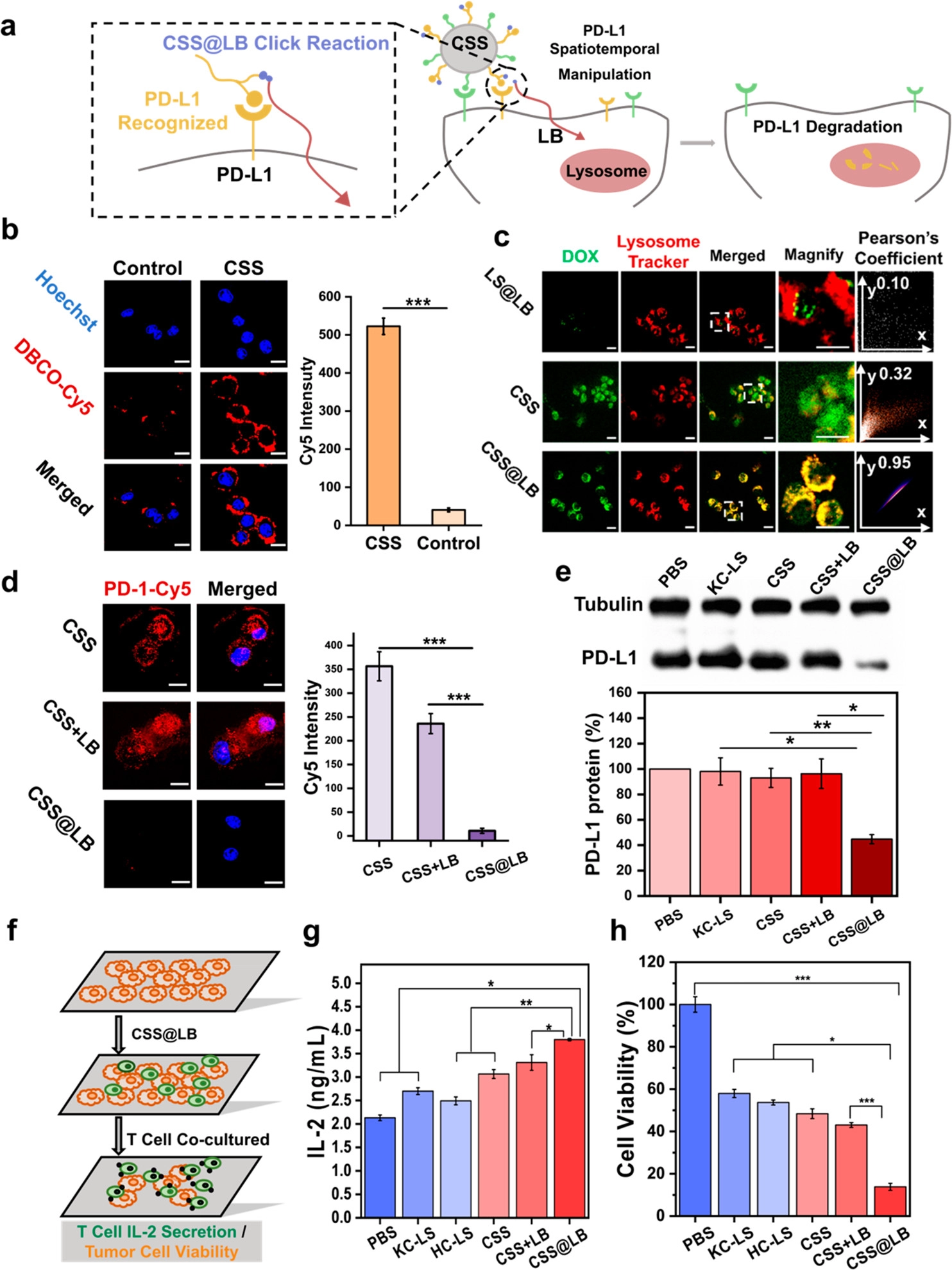 為了將PD-L1特異性地從細胞膜轉運至溶酶體,引入了一種溶酶體伴侶自噬基序KQ(KFERQQKILDQRFFEC),通過生物體內點擊化學實現了時間和空間上的序貫性分子識別與調控。從空間上來說,細胞膜上的PD-L1被轉運至溶酶體發生迅速、持續的降解以打破其“反復補償“的行為,并降低了其在細胞表面的含量。在時間維度上,一方面使該復雜調節過程的各個環節包括免疫檢查點阻斷、藥物釋放、PD-L1轉運等有序、可控地發生,另一方面使蛋白調控發生在靶向多肽KC/PD-L1發生配體-受體相互作用的”停留時間“內以提高后續蛋白轉運、降解的效率。具體來說,在KC側鏈引入疊氮,制備可發生點擊化學的CSS,并在KQ側鏈引入炔基,作為點擊化學的另一組件”溶酶體助推器(Lysosome Booster, LB)“。通過識別PD-L1/PD-L2停留在細胞表面的CSS可在指定時間點可控地與LB發生原位的點擊化學反應以激活對PD-L1的時空操控,將其從溶酶體發生持續的降解。將基于點擊化學的蛋白分選與調控策略被命名為” click chemistry-driven protein sorting (PROCLISORT) “。在體外和體內該策略均被證實相比于CSS/LB同時作用于蛋白更加高效,且具有增強的免疫激活能力,展現出了抗腫瘤潛能。