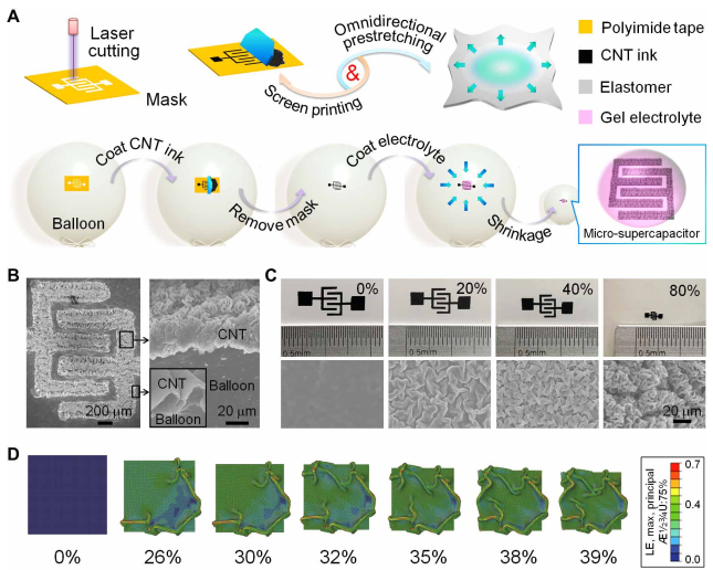 對(duì)于平面MSCs加工技術(shù)的優(yōu)化,需要考慮如何使更多的電極材料在微尺度范圍內(nèi)盡可能多地暴露在電解液中。近年來,預(yù)拉伸策略在可拉伸器件中得到了廣泛的研究,即覆蓋在單軸或雙軸預(yù)拉伸彈性體上的薄膜材料在襯底松弛后被壓縮變形,形成緊密堆積的褶皺結(jié)構(gòu)。實(shí)驗(yàn)結(jié)果表明,與塊狀結(jié)構(gòu)相比,豐富的堆疊結(jié)構(gòu)的存在可以在同一空間內(nèi)提供更多的暴露表面積。因此,我們?cè)噲D將絲網(wǎng)印刷方法與預(yù)拉伸策略相結(jié)合(圖1),目的是在有限的圖案區(qū)域內(nèi)產(chǎn)生緊密堆積的活性電極表面。在不需要復(fù)雜固定裝置的情況下,我們選擇膨脹狀態(tài)下的乳膠氣球作為全向預(yù)拉伸彈性基底,彌補(bǔ)了傳統(tǒng)預(yù)拉伸系統(tǒng)中拉伸方向的不均勻性。進(jìn)一步選用力學(xué)性能優(yōu)良、導(dǎo)電性高的碳納米管(CNT)漿料作為可壓縮電極材料。將CNT漿料刮涂到氣球表面的電極掩模板上,然后通過移除模板形成圖案化電極。值得一提的是,膨脹的氣球球囊可以為掩模板和電極材料的附著提供足夠的支撐,有效地降低了操作難度。在預(yù)涂一層凝膠電解質(zhì)后,將氣球放氣收縮便輕松地得到了皺縮結(jié)構(gòu)的MSC,實(shí)現(xiàn)了從宏觀操作到微器件生產(chǎn)的一步轉(zhuǎn)化。此外,全向收縮應(yīng)力制備的微器件具有顯著的保形性,可以實(shí)現(xiàn)多樣化的器件設(shè)計(jì)。
