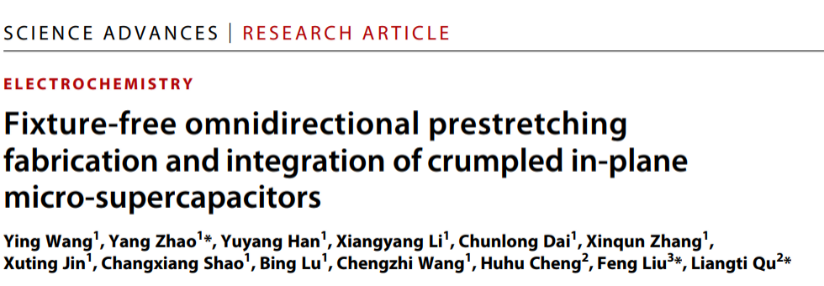 5月27日,北京理工大學(xué)化學(xué)與化工學(xué)院博士研究生王贏以第一作者身份在Science Advances期刊發(fā)表題目為“Fixture-free omnidirectional prestretching fabrication and integration of crumpled in-plane micro-supercapacitors”的研究論文。北京理工大學(xué)為第一通訊單位,北京理工大學(xué)化學(xué)與化工學(xué)院趙揚(yáng)特別研究員、清華大學(xué)化學(xué)系曲良體教授和中國科學(xué)院力學(xué)研究所劉峰副研究員為共同通訊作者。本研究得到了國家重點(diǎn)研發(fā)計(jì)劃項(xiàng)目、國家自然科學(xué)基金和北京市自然科學(xué)基項(xiàng)目等支持。