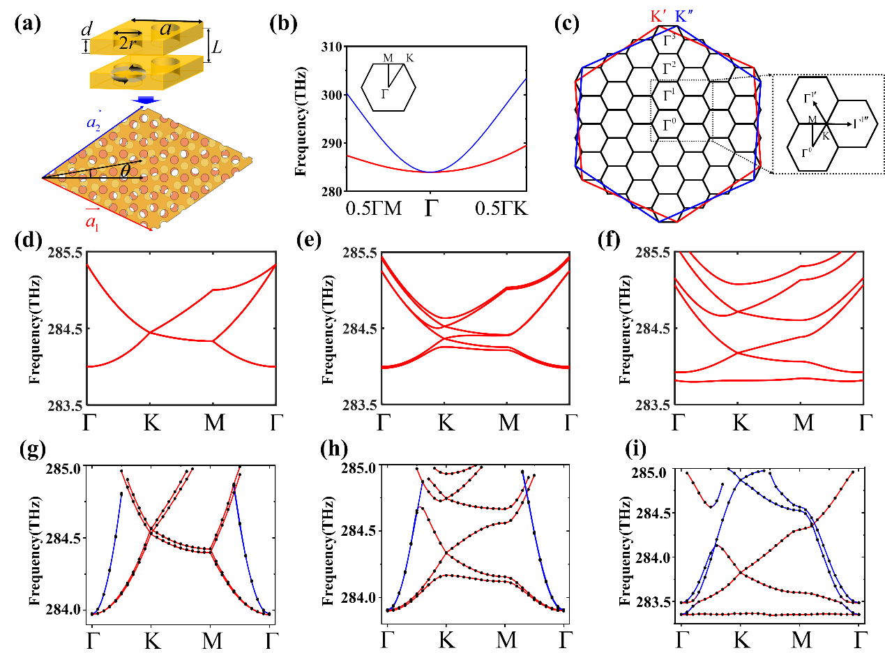 將上層光子晶體板旋轉角度θ,可以實現moiré光子晶體板結構,如圖1(a)的下插圖所示。旋轉使得雙層光子晶體板的平移對稱性發生了變化,導致相應的布里淵區也發生了改變,如圖1(c)所示。其中紅色和藍色的大六邊形分別對應頂層和底層光子晶體板的第一布里淵區。 K’ 和 K’’點用以標記上下兩層光子晶體板布里淵區的等效谷點。黑色小六邊形表示的是moiré光子晶體板的布里淵區。需要強調的是,由于布里淵區的能帶折疊效應,除了第一moiré布里淵區的Γ點以外,高階moiré布里淵區的每個Γ點也存在著具有二次色散的低頻光子能帶。