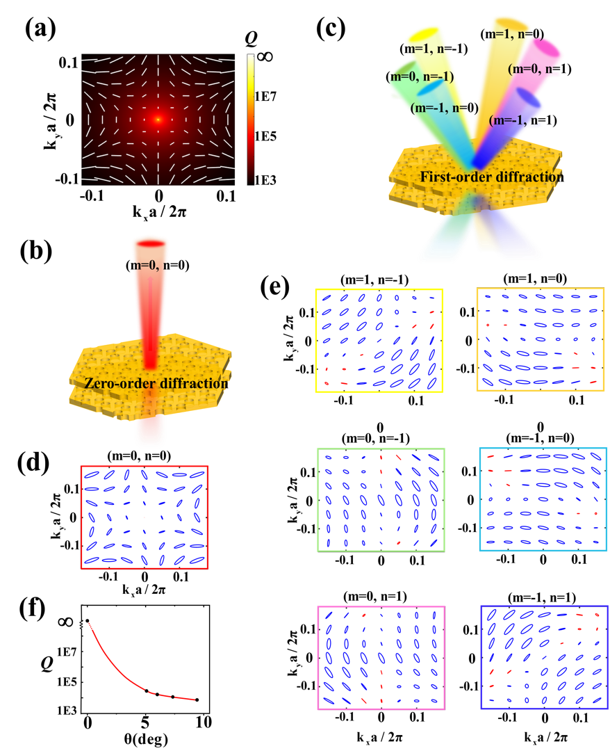 在旋轉雙層光子晶體板后,新形成的moiré原胞的周期顯著增大。在這種情況下,除了零階衍射通道外,moiré光子態還會存在其它高階衍射通道,如圖2(b)和圖2(c)所示。為了分析不同衍射通道的遠場輻射特性,研究人員計算了零階和一階衍射通道的遠場偏振態,如圖2(d)和圖2(c)所示。從圖中可以看出,由于上下對稱性的破缺,moiré光子晶體的零階遠場偏振態由線偏振態變為橢圓偏振態。此外,零階衍射通道Γ點仍對應遠場偏振奇點。但是對于其它的一階衍射通道,Γ點存在形式不同的遠場偏振態。上述結果說明moiré布里淵區中心(Γ點)的本征模式可以與光子連續能譜發生耦合,形成具有有限品質因子的泄漏光子態。