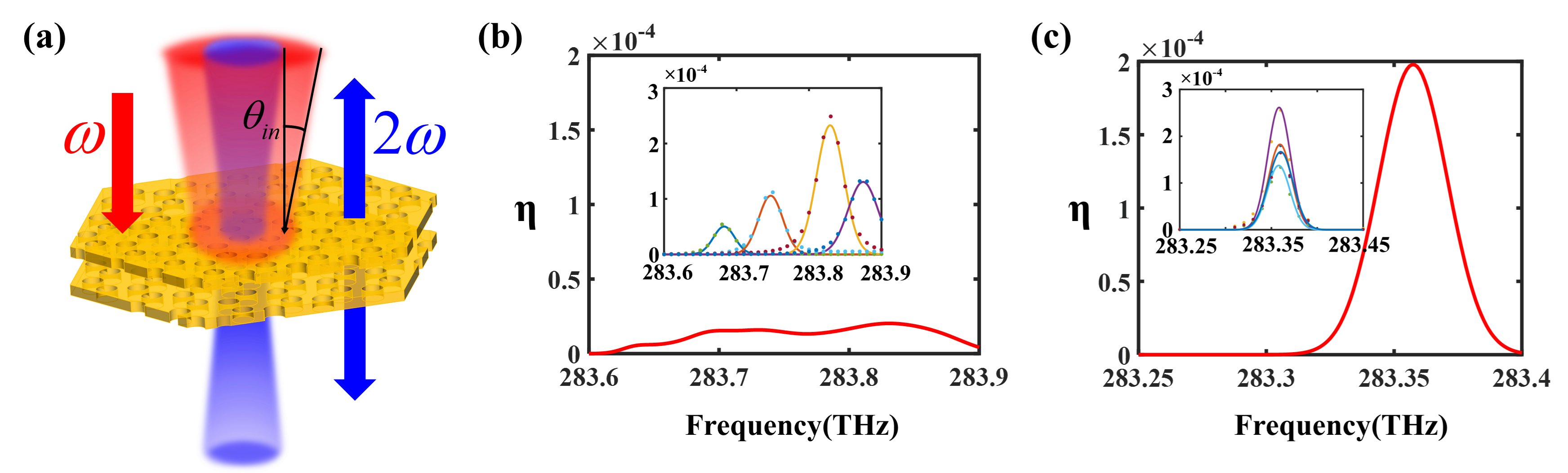 最后,研究人員通過數值計算證明,在廣角光源的激發下(圖3(a)所示),相比于傳統準BICs,具有相近品質因子的moiré平帶準BICs可以實現更高效的非線性增強效應。圖3(b-c)顯示了色散準BICs和moiré平帶準BICs的二次諧波(SHG)總增強效率。其中,插圖顯示的是不同入射角下二次諧波的增強效率。可以看出, moiré平帶準BICs在不同入射角度的激發下,都具有單一的共振頻率,使得不同入射角度的增強信號在目標頻率位置處進行疊加。而色散準BICs的共振頻率在不同入射角度的激發下會發生顯著的偏移,導致其非線性信號的強度總和相對較小。通過對比可知,基于moiré平帶準BICs的二次諧波強度為色散準BICs的10倍。