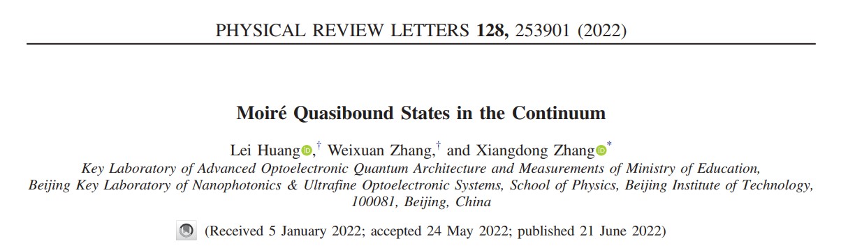 日前,北京理工大學物理學院張向東教授課題組,在基于moiré光子晶體板的連續譜束縛態研究方面取得重要進展。相關研究成果發表在近期的Phy. Rev. Lett. (128, 253902 (2022))上。研究工作得到了國家自然科學基金委和國家重點研發計劃的資助。北京理工大學物理學院黃磊博士(2021級)和張蔚暄博士(現集成電路與電子學院特立博士后)為論文的共同第一作者。