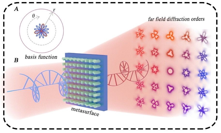 近日,北京理工大學王涌天教授團隊的黃玲玲教授等人與香港大學張霜老師合作,提出了一種基于達曼渦旋超表面的光束微分運算方法,實現了數學函數微分加減運算的全光表達。該項研究成果發表在國際著名期刊 Science Advances 上,題目為Basis function approach for diffractive pattern generation with Dammann Vortex Metasurfaces。