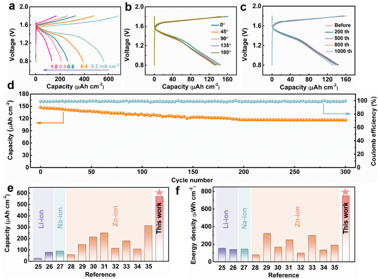 所構筑的Zn//MnO2微電池在電流密度為0.2 mA cm-2的容量高達0.57 mAh cm-2,能量密度0.75 mWh cm-2,性能優于大多數水系鋅離子微電池以及鋰/鈉微電池。