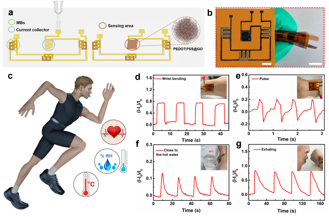 得益于全激光加工技術的可編輯性、非接觸式和高效率的特點,可以快速在片上直接寫入一種不需要外部電源的柔性多功能集成系統。該集成系統可以連續監測人體生理信號(應變、溫度和濕度信號),以實現個性化醫療。