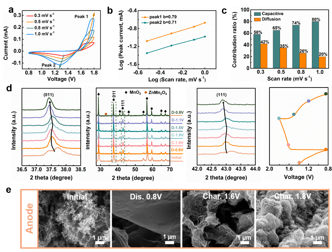 由反應動力學分析可知,Zn//MnO2中的反應動力學由電容行為控制。充放電過程中電極的非原為XRD和SEM圖像進一步說明了電池的儲能機制:正極發生Zn2+的嵌入脫出過程,負極發生Zn2+的電鍍剝離過程。