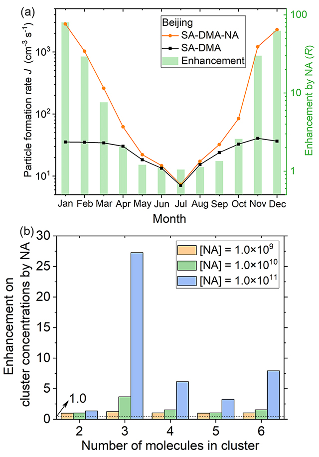 圖2. (a) 北京地區(qū)不同月份的粒子形成速率及硝酸對粒子形成速率的促進(jìn)強(qiáng)度R。(b) 不同濃度下,硝酸的參與對團(tuán)簇?cái)?shù)濃度的促進(jìn)強(qiáng)度