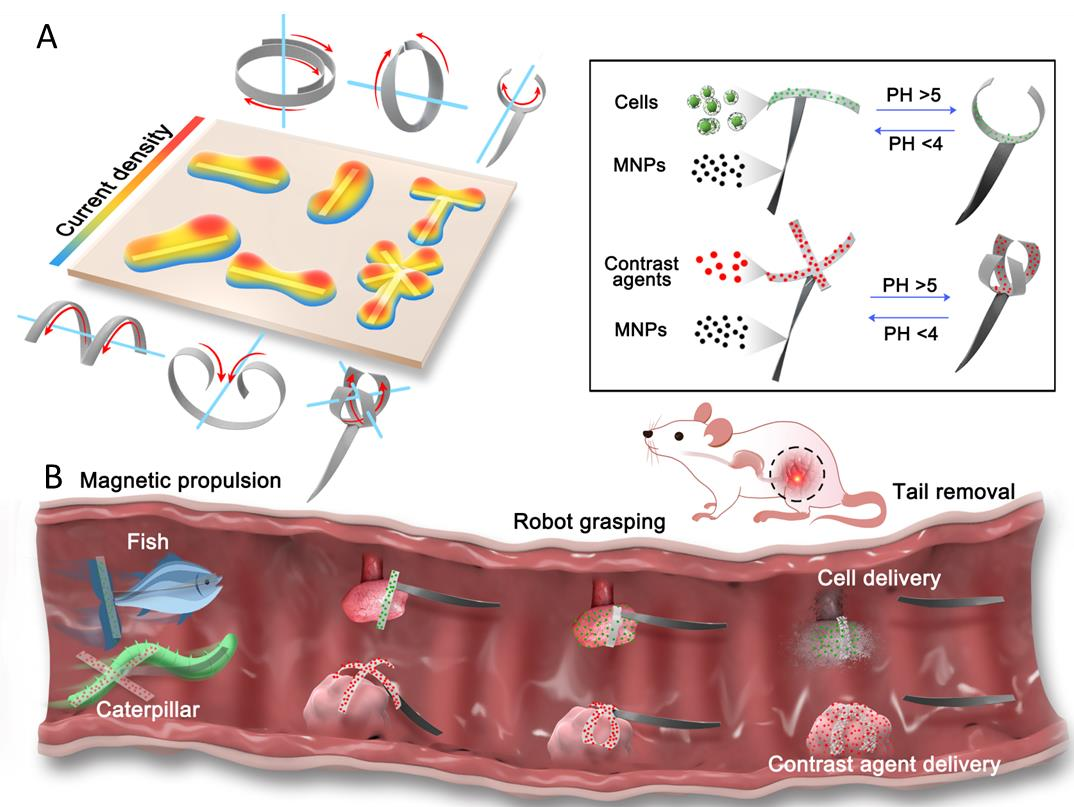 編輯:謝雨珈 審核:王亞斌 閱讀次數(shù):北京理工大學智能機器人研究所王化平教授團隊在微納機器人與生物醫(yī)學工程領域取得重要進展,12月14日,其研究成果“基于可編程非均一電沉積的模塊化水凝膠微機器人”(Programmable aniso-electrodeposited modular hydrogel microrobots),以研究長文(Research Article)形式在線發(fā)表于科學子刊《科學進展》 (Science Advance)。該成果首創(chuàng)了一種可集成不同功能與形變模塊的任意構型單薄膜軟體微機器人一體化制造方法,從而解決了微機器人在人體等活體封閉環(huán)境下同時開展顯影、給藥、修復等多序列復雜任務作業(yè)的適應性問題,為癌癥等重大疾病開發(fā)更智能、更集成、更高效的治療手段提供了新思路。
