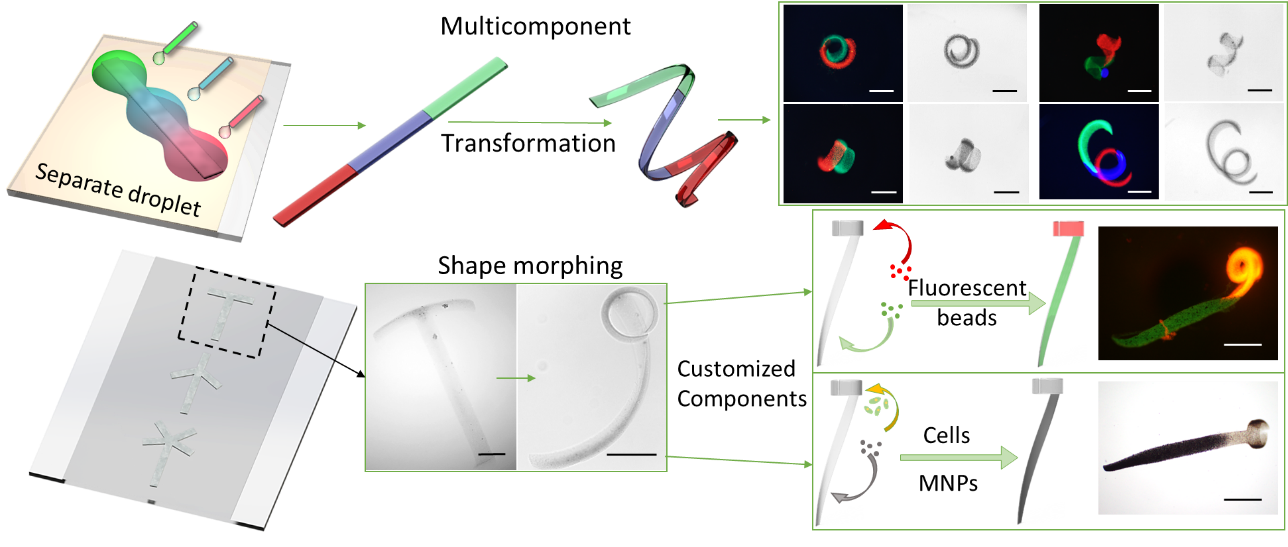 該團隊在前期研究自形變褐藻酸微機器人的基礎上(Nature Communications, vol. 12(1), 2021. https://doi.org/10.1038/s41467-020-20697-w),進一步探索了褐藻酸液體如何在非均一電場作用下固化為不同大小網(wǎng)格結構組成的凝膠體。發(fā)現(xiàn)這些網(wǎng)格結構不僅在受到離子濃度、pH值變化激勵時能夠膨脹、收縮使凝膠整體展現(xiàn)出特定的形變特征,還能像一張網(wǎng)包絡嵌入各種徑粒大小的成分。該發(fā)現(xiàn)激發(fā)了團隊研發(fā)能夠集成不同形變模式、功能成分的模塊化微機器人的靈感。
